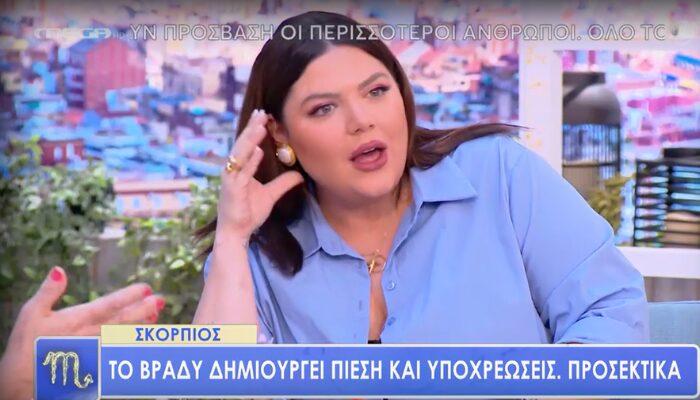 Πιο συγκεκριμένα η γνωστή αστρολόγος, καθώς έλεγε τις προβλέψεις των ζωδίων, όταν έφτασε στο ζώδιο του Σκορπιού, στο οποίο ανήκει και η παρουσιάστρια, τόνισε ότι πρέπει να προσέχει τις επόμενες ημέρες, ειδικότερα για τα θέματα υγείας.