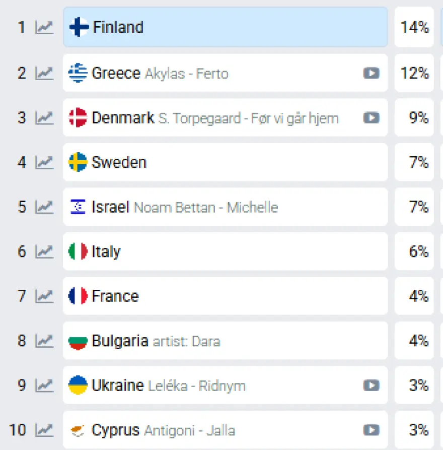 Στην τρίτη θέση των προβλέψεων συναντάμε τη Δανία με 9%, ενώ ακολουθούν η Σουηδία και το Ισραήλ, που ισοβαθμούν στο 7%. Την έκτη θέση καταλαμβάνει η Ιταλία με 6%, ενώ τη δεκάδα συμπληρώνουν η Γαλλία και η Βουλγαρία με 4%, καθώς και η Ουκρανία και η Κύπρος με 3% αντίστοιχα.
