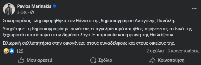 Διαβάστε ακόμα: Πέθανε η δημοσιογράφος Αντιγόνη Πανέλλη σε ηλικία 57 ετών