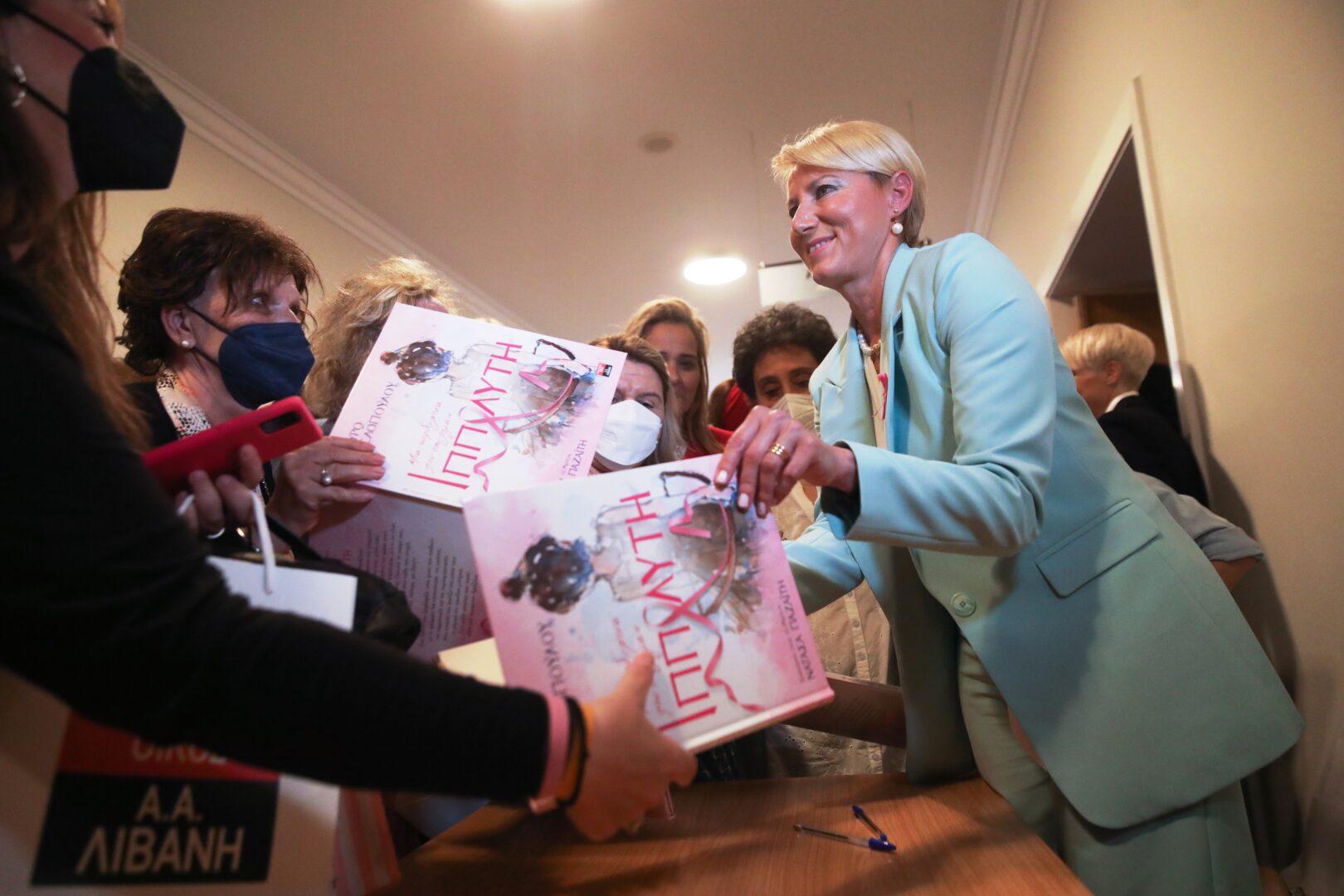 Μέσα από το σακάκι φορούσε ένα πολύ σικ κρουαζέ λευκό τοπ, το οποίο ταίριαζε υπέροχα με το χρώμα του κοστουμιού. Τα κοσμήματά της ήταν διακριτικά, αλλά κατάφεραν να δώσουν επιπλέον πόντους στιλ στο σύνολό της. Όσον αφορά το βιβλίο, αποτελεί μια φωτεινή έμπνευση για τις γυναίκες που νοσούν από τον καρκίνο του μαστού και δεν ξέρουν πώς να μεταδώσουν το μήνυμα στα παιδιά τους. «Η μάχη με τον καρκίνο δεν αφορά μόνο τον ασθενή και το θεράποντα ιατρό της. Είναι μια μάχη όλης της οικογένειας» έχει αναφέρει στο παρελθόν η Νατάσα Παζαΐτη.