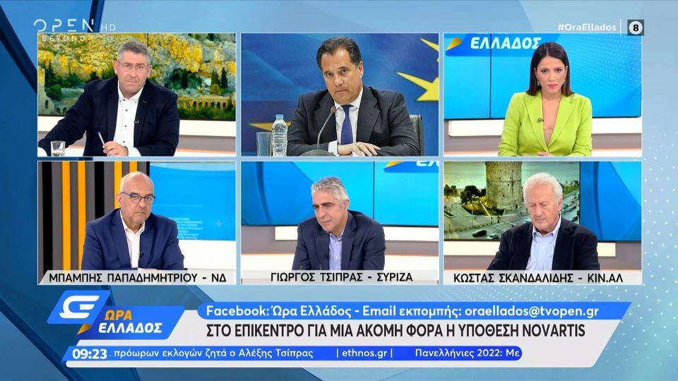Βαριές εκφράσεις αντάλλαξαν ζωντανά στον τηλεοπτικό αέρα ο υπουργός Ανάπτυξης, Άδωνις Γεωργιάδης και ο βουλευτής του ΣΥΡΙΖΑ, Γιώργος Τσίπρας με αφορμή την υπόθεση της Novartis.