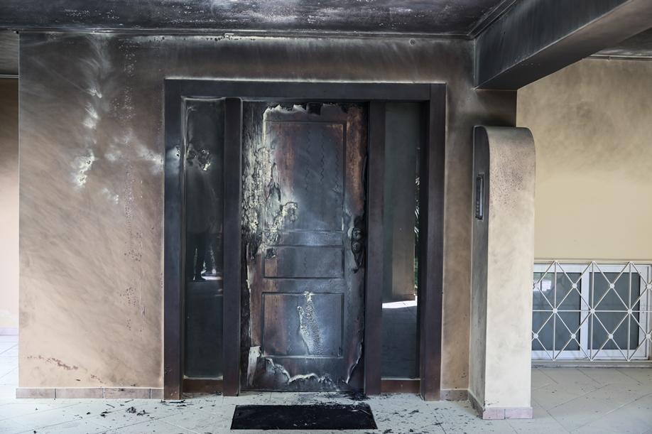 Η είσοδος της πολυκατοικίας έχει καταστραφεί και οι τοίχοι έχουν μαυρίσει. Ο ίδιος ο Άρης Πορτοσάλτε έκανε λόγο για αναβάθμιση της τρομοκρατίας, τονίζοντας ότι οι δράστες ήθελαν να μπει φωτιά στο κτίριο και να δολοφονήσουν.