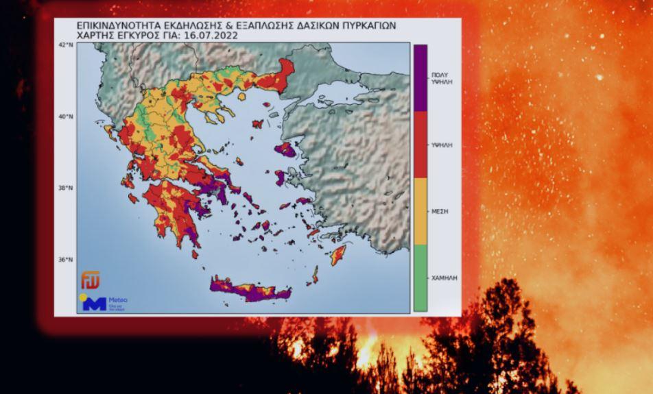 Πολύ υψηλός κίνδυνος πυρκαγιάς (κατηγορία κινδύνου 4) προβλέπεται το Σάββατο 16 Ιουλίου, για πέντε περιφέρειες της χώρας.