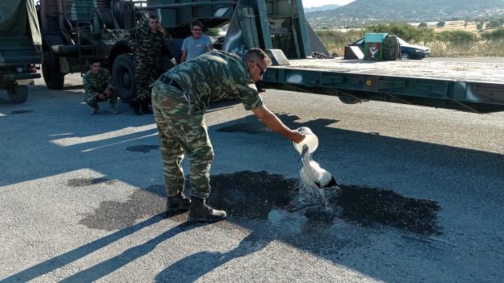 Η στιγμή που ένας μικρός πελαργός, καμένος στα πόδια, δέχεται τη φροντίδα ενός στρατιωτικού στον διάδρομο αποπροσγείωσης στο αεροδρόμιο του Πολυχνίτου εντυπωσιάζει.