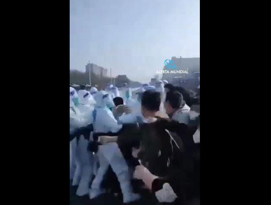 🇨🇳 | URGENTE: Los empleados de #Foxconn y la policía con ropa protectora continúan enfrentadose en este momento en #Zhengzhou. #China pic.twitter.com/gTRnESuGhx