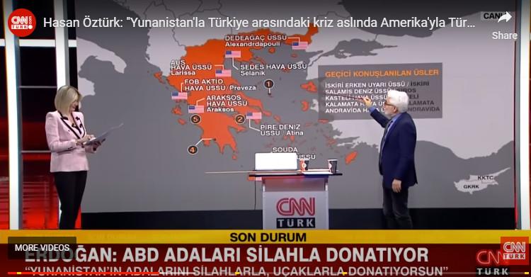 Τα επεκτατικά… συναισθήματα των πολιτών της Τουρκίας επιχειρεί να καθορίσει ο τούρκος δημοσιογράφος της Γενί Σαφάκ, Χασάν Οζτούρκ, στη διάρκεια ανάλυσής του για τα ελληνοτουρκικά θέματα στον τουρκικό τηλεοπτικό σταθμό CNNTURK (στη φωτογραφία, επάνω, από το YouTube).