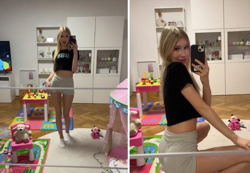 «Πληρώνεσαι για το παιχνίδι με παιδιά» ανέφερε η 19χρονη και πρόσθεσε, «μόλις τα παιδιά κοιμηθούν, μπορώ να φροντίσω τους ανύπαντρους μπαμπάδες». Στο βίντεο με τίτλο «Θα με προσλάμβανες;» — η ξανθιά βόμβα ποζάρει στον καθρέφτη ενός παιδικού δωματίου, φορώντας ένα μαύρο crop top και γκρι μίνι σορτς.