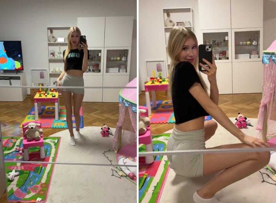 «Πληρώνεσαι για το παιχνίδι με παιδιά» ανέφερε η 19χρονη και πρόσθεσε, «μόλις τα παιδιά κοιμηθούν, μπορώ να φροντίσω τους ανύπαντρους μπαμπάδες». Στο βίντεο με τίτλο «Θα με προσλάμβανες;» — η ξανθιά βόμβα ποζάρει στον καθρέφτη ενός παιδικού δωματίου, φορώντας ένα μαύρο crop top και γκρι μίνι σορτς.