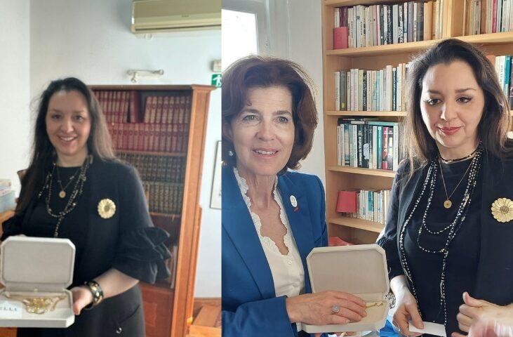 Η Γαλλίδα πρέσβειρα τίμησε την Έλλη φορωντας το ολυμπιακό κόσμημα στις εκδηλώσεις της τελετής της αφής της ολυμπιακής φλόγας κι επέλεξε να το συνδυάσει με ένα ζευγάρι χρυσά σκουλαρίκια από τη νέα συλλογή MARGI της σχεδιάστριας για την άνοιξη καλοκαίρι του 2024