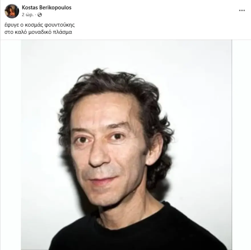 «Έφυγε ο Κοσμάς Φουντούκης. Στο καλό, μοναδικό πλάσμα» σημείωσε χαρακτηριστικά ο Κώστας Μπερικόπουλος στη λεζάντα της ανάρτησης στον προσωπικό του λογαριασμό στο Facebook την οποία και συνόδευσε με μια φωτογραφία του συναδέλφου του.