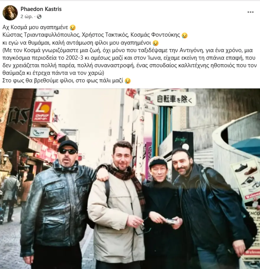 «Αχ Κοσμά μου αγαπημένε. Με τον Κοσμά γνωριζόμαστε μια ζωή, όχι μόνο που ταξιδέψαμε την “Αντιγόνη” για ένα χρόνο, μια παγκόσμια περιοδεία το 2002 – 2003 και αμέσως μαζί και στον “Ίωνα”. Είχαμε εκείνη τη σπάνια επαφή, που δεν χρειάζεται πολλή παρέα, πολλή συναναστροφή. Ένας σπουδαίος καλλιτέχνης ηθοποιός που τον θαύμαζα κι έτρεχα πάντα να τον χαρώ” τόνισε, μεταξύ άλλων, ο ηθοποιός Φαίδων Καστρής σε ανάρτηση στα μέσα κοινωνικής δικτύωσης.