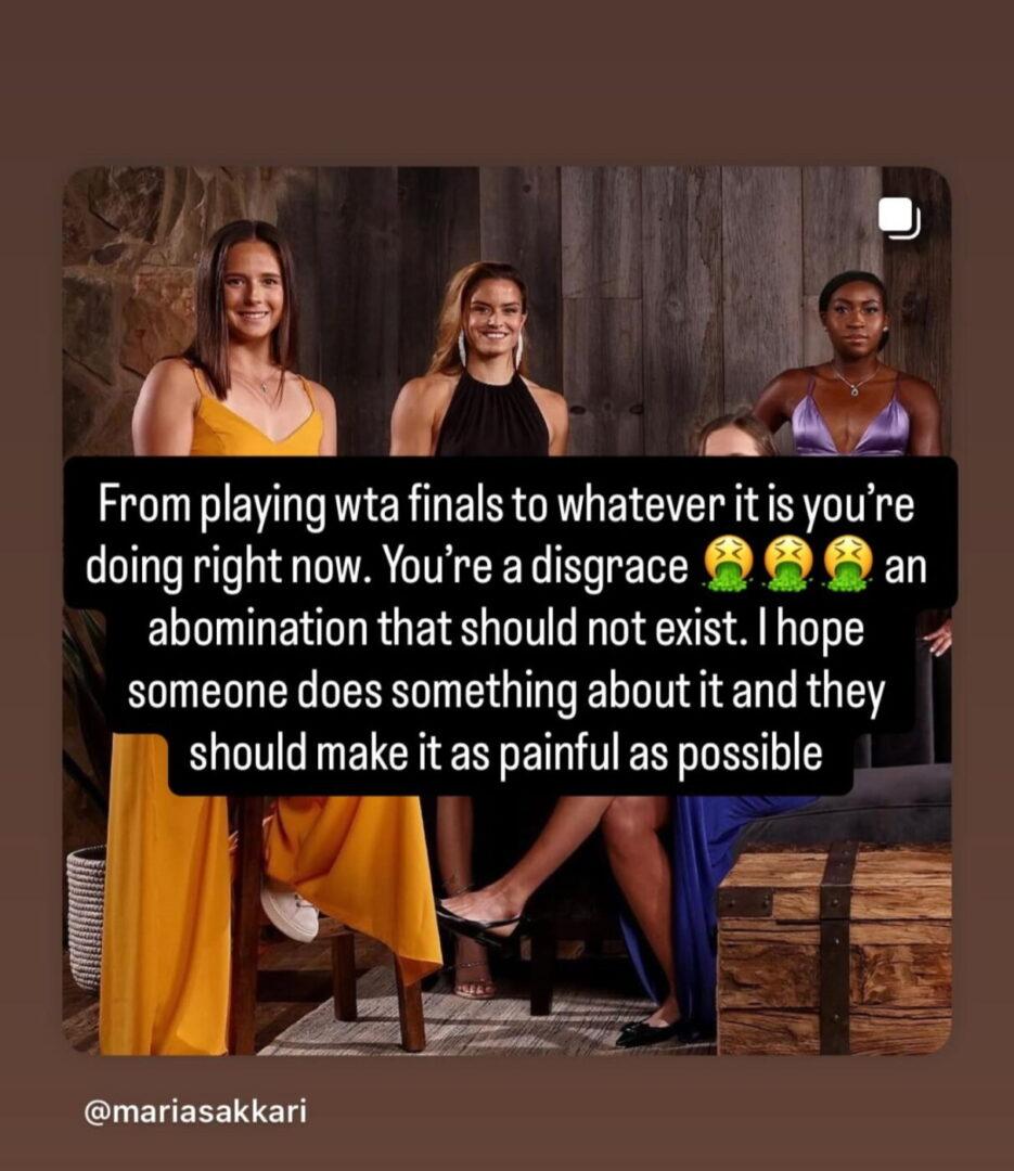 Αφού δημοσιοποίησε τα μηνύματα, η Ελληνίδα τενίστρια έγραψε ένα μακροσκελές μήνυμα στα Instagram Stories της. «Συνήθως δεν το κάνω αυτό, αλλά ήθελα απλώς να μοιραστώ μερικά λόγια. Δεν υπάρχει πραγματικά κάτι να πω για τα μηνύματα που έλαβα μετά τον αγώνα μου – κάθε τενίστρια τα λαμβάνει σχεδόν κάθε μέρα. Αυτό που θέλω να πω είναι ότι ήταν μια δύσκολη σεζόν, σίγουρα κάτω από τις δικές μου προσδοκίες.