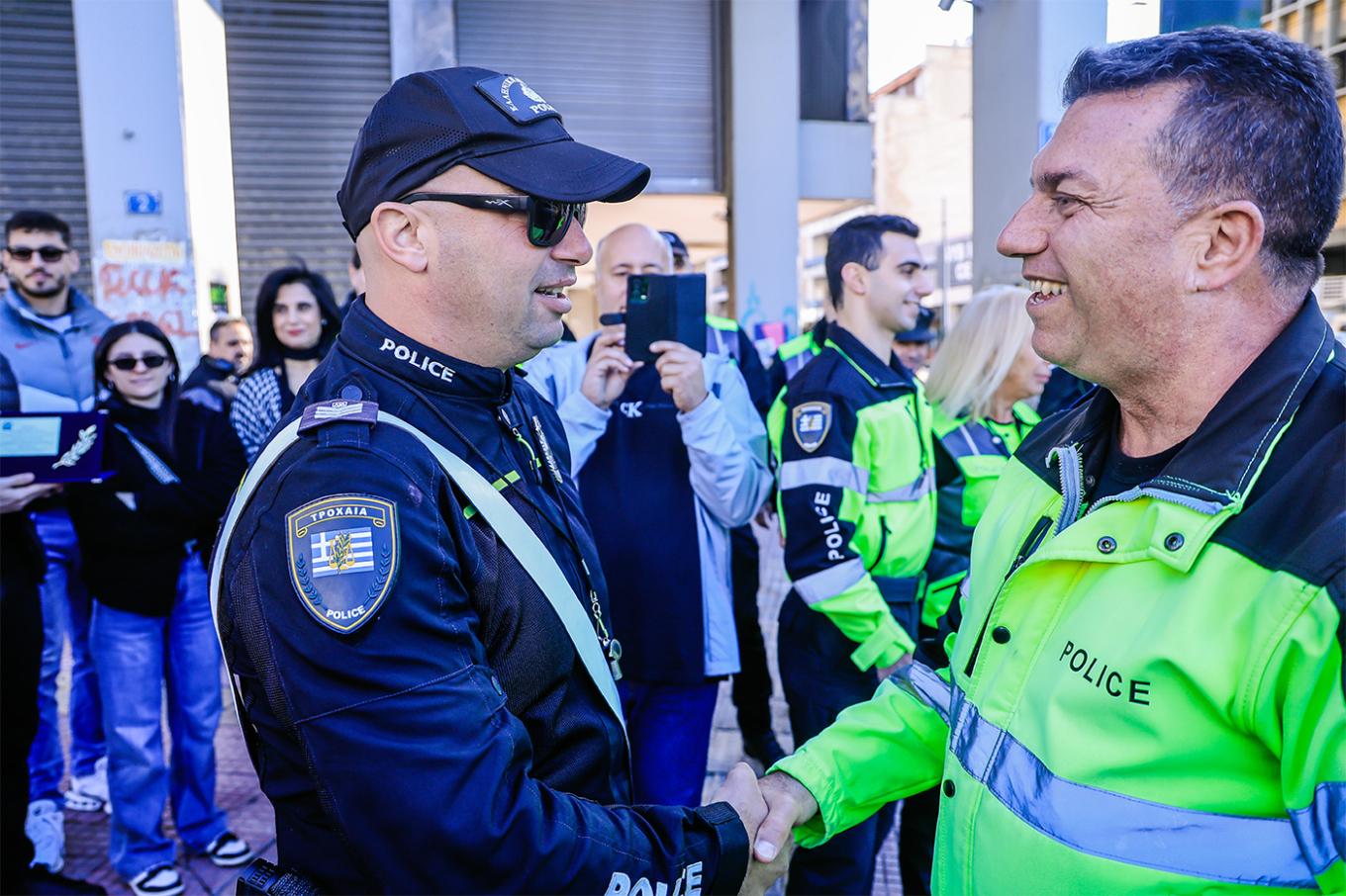 Συνάδελφοι και κάτοικοι της περιοχής, με τους οποίους είχε καθημερινή επαφή και στους οποίους ήταν ιδιαίτερα αγαπητός, τον αποχαιρέτησαν το Σάββατο πρωί στο σημείο όπου πέρασε μια υπηρεσιακή ζωή. Η ηγεσία της Υπηρεσίας του ήταν εκεί για να τον βραβεύσει, όπως και η Τοπική Διοίκηση Αττικής της Διεθνούς Ενώσεως Αστυνομικών, του μεγαλύτερου συλλόγου φιλίας Αστυνομικών παγκοσμίως. Παρόντες στη συνάντηση ήταν και συνάδελφοί του τροχονόμοι της ίδιας Υπηρεσίας οι οποίοι κι αυτοί συνταξιοδοτήθηκαν και βραβεύτηκαν.