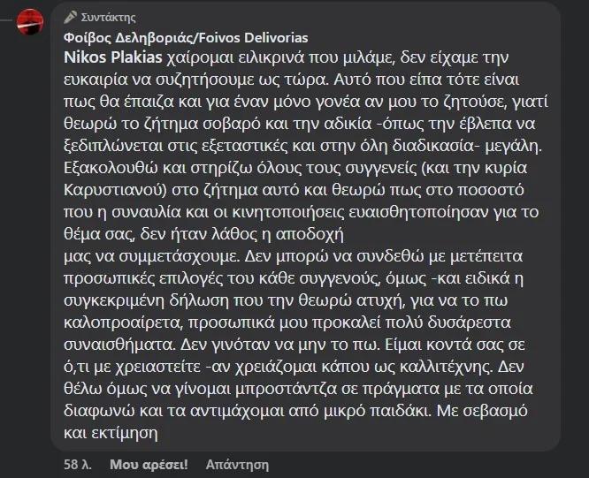 Ωστόσο, η παρέμβασή του στάθηκε αφορμή για μια σκληρή απάντηση από τον Νίκο Πλακιά. Ο πατέρας των δίδυμων κοριτσιών που χάθηκαν στο δυστύχημα των Τεμπών, σχολιάζοντας κάτω από την ανάρτηση του τραγουδιστή, του καταλογίζει σημαντικό μερίδιο ευθύνης για όσα ακολούθησαν τη μεγάλη συναυλία στο Καλλιμάρμαρο, η οποία είχε πραγματοποιηθεί στη μνήμη των θυμάτων.