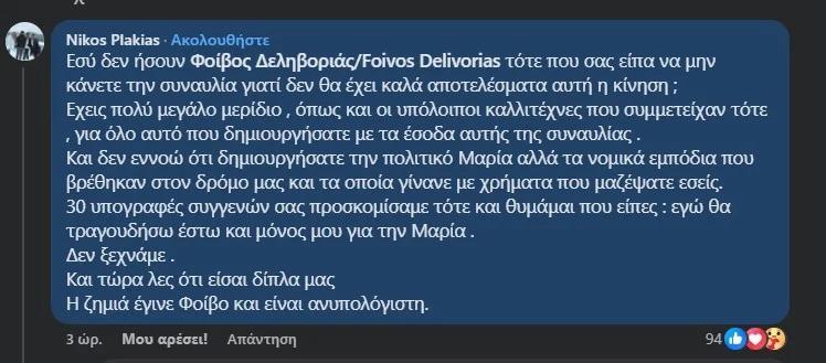 «Εσύ δεν ήσουν τότε που σας είπα να μη γίνει η συναυλία γιατί δεν θα έχει καλά αποτελέσματα;» αναφέρει χαρακτηριστικά, υποστηρίζοντας ότι τόσο ο Φοίβος Δεληβοριάς όσο και οι υπόλοιποι καλλιτέχνες που συμμετείχαν φέρουν ευθύνη για τις εξελίξεις. Ξεκαθαρίζει μάλιστα ότι δεν αναφέρεται στη δημόσια παρουσία της Μαρίας Καρυστιανού, αλλά στα εμπόδια που, όπως λέει, προέκυψαν στον δικαστικό αγώνα των οικογενειών, με χρήματα που συγκεντρώθηκαν τότε.