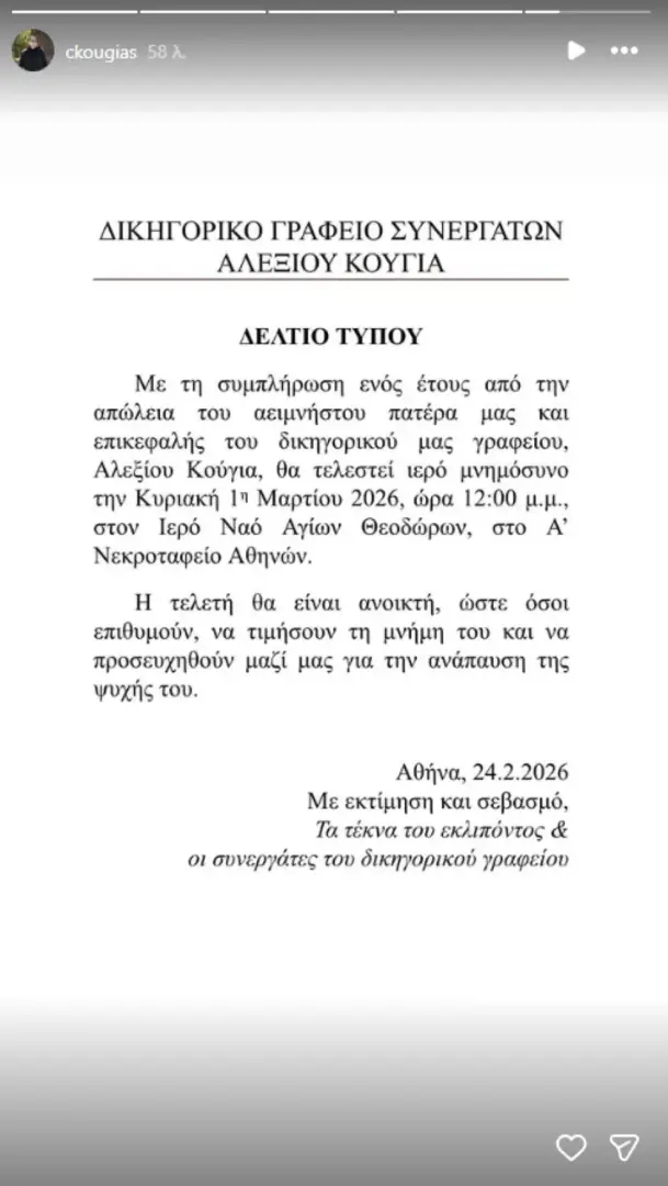 Ένας χρόνος συμπληρώνεται από τον θάνατο του Αλέξη Κούγια και η οικογένεια και οι συνεργάτες του ετοιμάζονται να τιμήσουν τη μνήμη του με την τέλεση του καθιερωμένου ετήσιου μνημοσύνου. Σε σχετική ανακοίνωση που δόθηκε στη δημοσιότητα, τα παιδιά του εκλιπόντος ποινικολόγου, μαζί με τους ανθρώπους του δικηγορικού του γραφείου, γνωστοποιούν τις λεπτομέρειες της τελετής, καλώντας όσους το επιθυμούν να παρευρεθούν.