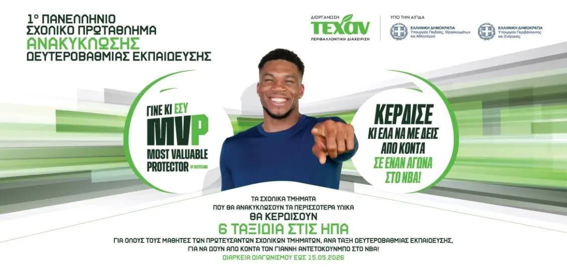 TEXAN – 1ο Πανελλήνιο Σχολικό Πρωτάθλημα Ανακύκλωσης- Μια μεγάλη γιορτή για το περιβάλλον με τον Αντώνη Ρέμο & έπαθλο ένα ταξίδι στις ΗΠΑ με τον Γιάννη Αντετοκούνμπο! Ανακύκλωσε και κέρδισε ταξίδι στο NBA! Συμμετοχή στο 1ο Πανελλήνιο Σχολικό Πρωτάθλημα Ανακύκλωσης της ΤΕΧΑΝ. Δείτε τους όρους και τη μεγάλη συναυλία του Αντώνη Ρέμου.