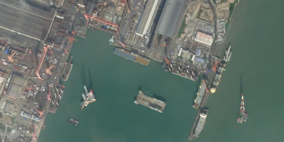 Δορυφορικές εικόνες από το Planet Labs δείχνουν ένα σκάφος με μια μεγάλη, ανοιχτή επίπεδη κορυφή υπό κατασκευή στο Guangzhou Shipyard στο νησί Longxue, στη νότια επαρχία Guangdong.