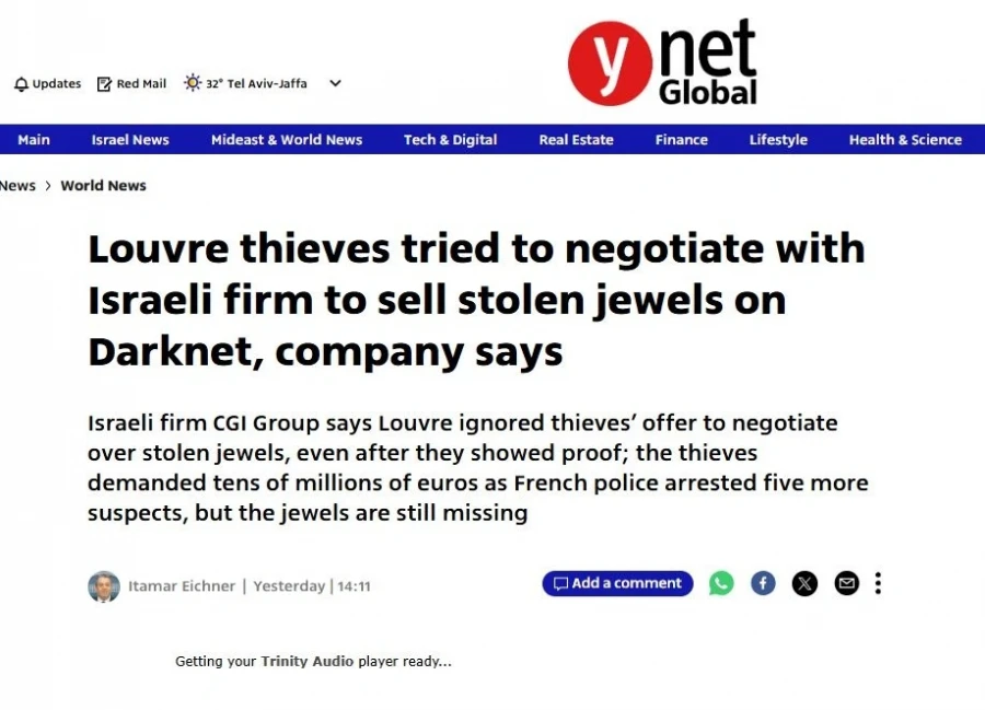 Δώδεκα ημέρες μετά από την ιστορική ληστεία κοσμημάτων στο Μουσείο του Λούβρου, μια ισραηλινή εταιρεία ασφαλείας δήλωσε ότι οι δράστες πίσω από την κλοπή επικοινώνησαν μαζί της, ζητώντας της να διαπραγματευτούν κρυφά για την πώληση των κλεμμένων κομματιών μέσω του darknet. Η CGI Group είναι μια ισραηλινή εταιρεία που παρέχει υπηρεσίες επιχειρηματικής ευφυΐας, στρατηγικών συμβουλών και ασφάλειας.