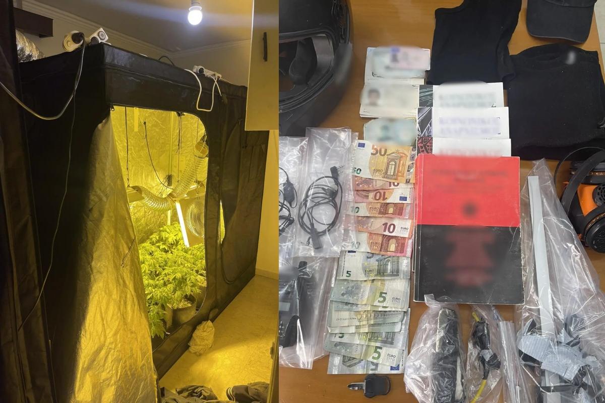 Ακόμα, βρέθηκαν 18 κιλά κάνναβη, δενδρύλια κάνναβης, υπολογιστές και χρηματικά ποσά.