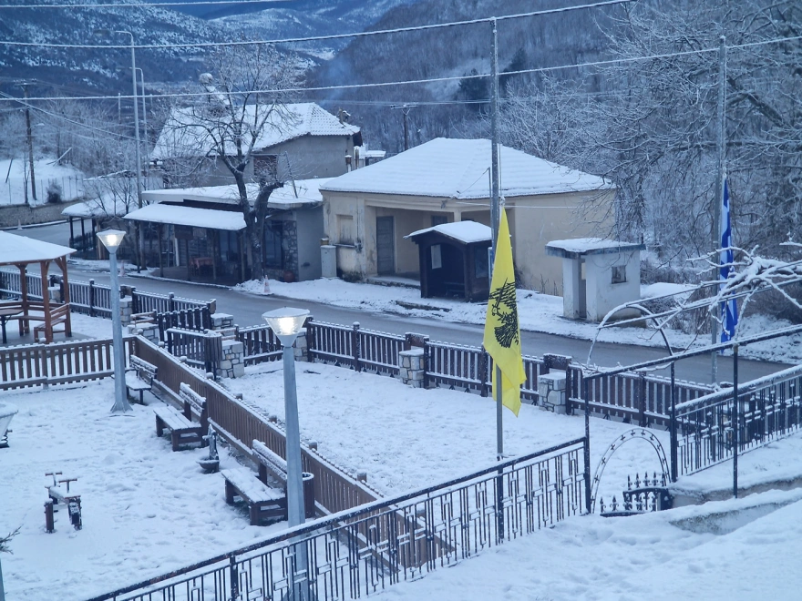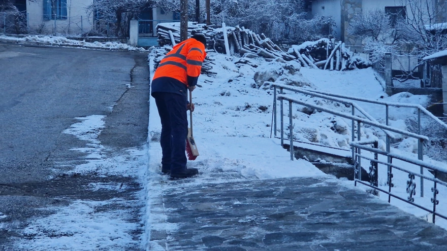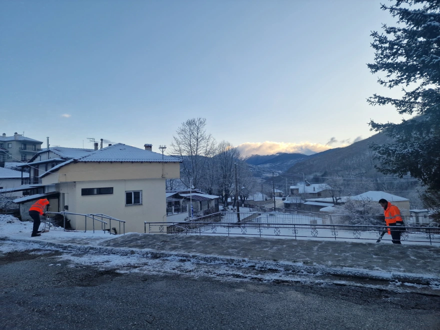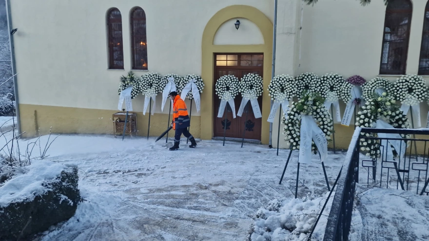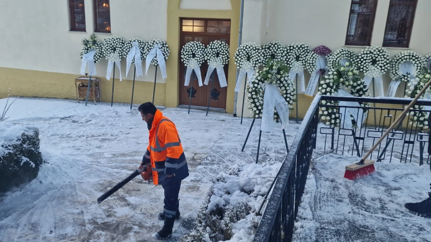 Εργαζόμενοι του Δήμου βρίσκονται από νωρίς στην εκκλησία για να καθαρίσουν το χιόνι πριν τη μεταφορά της σορού και την άφιξη του κόσμου.