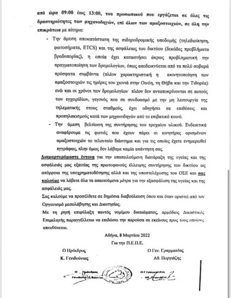 Ειδικότερα με εξώδικό της,προς τον ΟΣΕ, το Υπουργείο Μεταφορών και Υποδομών, τη ΡΑΣ, και του υπουργείο Εργασίας, με ημερομηνία 8 Μαρτίου 2022, η Ενωση, ενημέρωνε για απεργιακή της κινητοποίηση και προειδοποιούσε για την «επαπειλούμενη διατάραξη της υγείας και της ασφάλειας των εργαζομένων, λόγω της πρωτοφανούς έλλειψης συντήρησης του δικτύου, ως απόρροια της υποχρηματοδότησης αλλά και της υποστελέχωσης του ΟΣΕ».