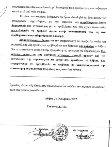 Καταλήγοντας οι μηχανοδηγοί καλούσαν τους αρμόδιους «να προβείτε άμεσα αυτήν αποκατάσταση των ως άνω προβλημάτων στην σιδηροδρομική υποδομή. Διαμαρτυρόμαστε έντονα για την επαπειλούμενη διατάραξη της υγείας και της ασφάλειάς μας εξαιτίας των προβλημάτων στο δίκτυο και σας καλούμε να λάβετε όλα τα απαιτούμενα μέτρα για την εξασφάλιση της υγείας και της ασφάλειάς μας».