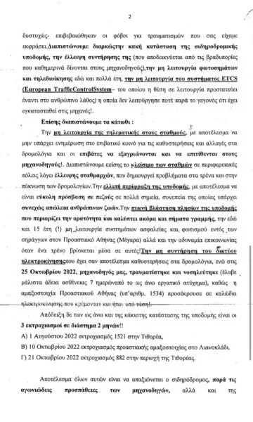Με άλλο εξώδικο, που είχε αποστείλει, με ημερομηνία 31 Οκτώβρη 2022, προς τον ΟΣΕ, το Υπουργείο Μεταφορών και Υποδομών, την Ρυθμιστική Αρχή Σιδηροδρόμων (ΡΑΣ) και την Hellenic Train, η Πανελλήνια Ένωση Προσωπικού Ελξης, ενημέρωνε για τη μη λειτουργία φωτοσημάτων και τηλεδιοίκησης εδώ και πολλά έτη και τη μη λειτουργία του συστήματος ETCS, παρά το γεγονός ότι έχει εγκατασταθεί.