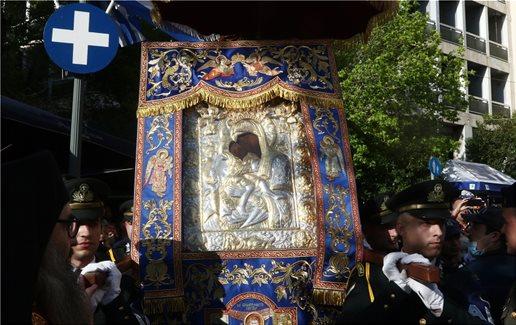 Με τη συνοδεία μελών της ιερής κοινότητας της Μοναστικής Πολιτείας, τελέστηκε η επίσημη υποδοχή της ιερής εικόνας της Παναγίας «Άξιον Εστι», στην πλατεία της Μητρόπολης Αθηνών, παρουσία του Αρχιεπισκόπου Αθηνών και πάσης Ελλάδος Ιερωνύμου και εκπροσώπων της πολιτικής και πολιτειακής ηγεσίας, την Τετάρτη 3 Μαΐου 2023.