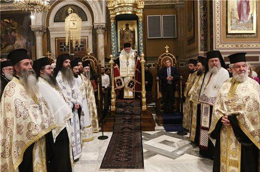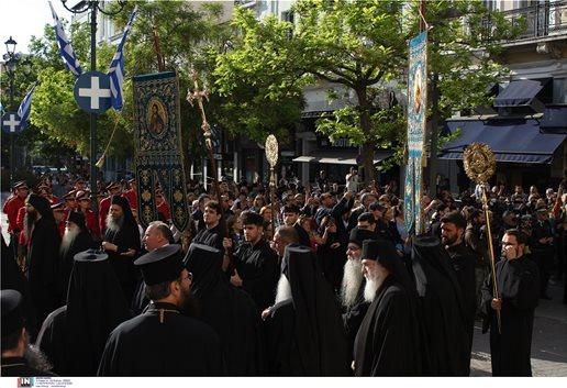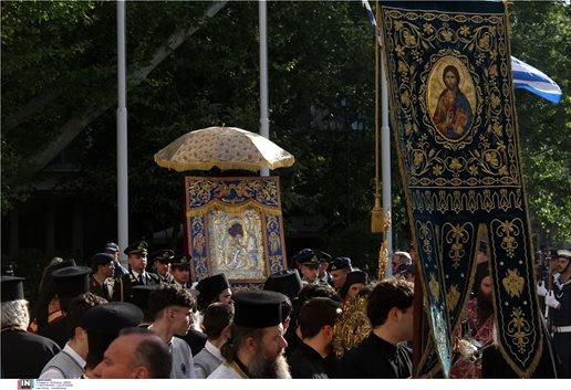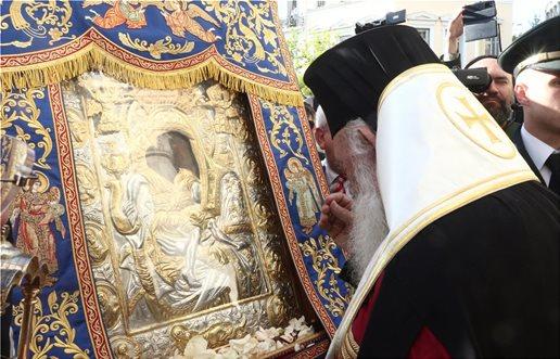 Με τη συνοδεία μελών της ιερής κοινότητας της Μοναστικής Πολιτείας, τελέστηκε η επίσημη υποδοχή της ιερής εικόνας της Παναγίας «Άξιον Εστι», στην πλατεία της Μητρόπολης Αθηνών, παρουσία του Αρχιεπισκόπου Αθηνών και πάσης Ελλάδος Ιερωνύμου και εκπροσώπων της πολιτικής και πολιτειακής ηγεσίας, την Τετάρτη 3 Μαΐου 2023.