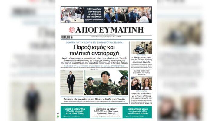 Διαβάστε στην Απογευματινή Ο Μητσοτάκης στον Καναδά με μηνύματα για επενδύσεις Οι τσολιάδες, τα ενσταντανέ και οι 300.000 ομογενείς. ——– ΜΟΜΦΗ ΓΙΑ ΤΑ ΤΕΜΠΗ ΜΕ ΠΡΩΤΟΒΟΥΛΙΑ ΠΑΣΟΚ Παροξυσμός και πολιτική «αναταραχή» Ακραία πόλωση από την αντιπολίτευση πάνω στην εθνική εορτή. Υπερέβη τα εσκαμμένα ο Κασσελάκης για εκλογές με διεθνείς παρατηρητές (!!!) Την «κυνική εκμετάλλευση της […]