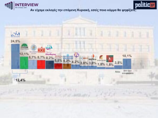 Η πρόθεση ψήφου δείχνει μια σταδιακή υποχώρηση της Νέας Δημοκρατίας (ΝΔ), η οποία παραμένει στην πρώτη θέση με 24,5%. Ωστόσο, αυτή η πτώση της ΝΔ υπογραμμίζει την αβεβαιότητα στην πολιτική σκηνή της χώρας. Το ΠΑΣΟΚ υποχωρεί στο 12,1%, ενώ η Ελληνική Λύση και το ΚΚΕ σημειώνουν άνοδο και καταλαμβάνουν την τρίτη θέση με 8,7%. Η Πλεύση Ελευθερίας καταγράφει εντυπωσιακή άνοδο, ξεπερνώντας το 5%, ενώ ο ΣΥΡΙΖΑ κατατάσσεται στην έκτη θέση.