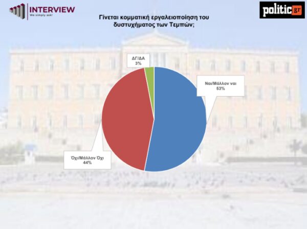 Δημοσκόπηση Interview: 6 στους 10 θα συμμετάσχουν στα συλλαλητήρια για τα Τέμπη. Η πρόσφατη δημοσκόπηση της εταιρείας Interview για λογαριασμό της Politic αποκαλύπτει ενδιαφέροντα αποτελέσματα σχετικά με τις προτιμήσεις των πολιτών και την πολιτική κατάσταση της χώρας, καθώς και τις αντιδράσεις των πολιτών στο δυστύχημα στα Τέμπη.