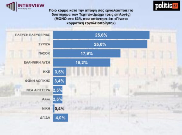 Η πολιτική καταγραφή για την εργαλειοποίηση του δυστυχήματος στα Τέμπη είναι διχαστική. Το 53% των ερωτηθέντων πιστεύει ότι το δυστύχημα χρησιμοποιείται ως πολιτικό εργαλείο, ενώ το 44% διαφωνεί με αυτή την εκτίμηση.