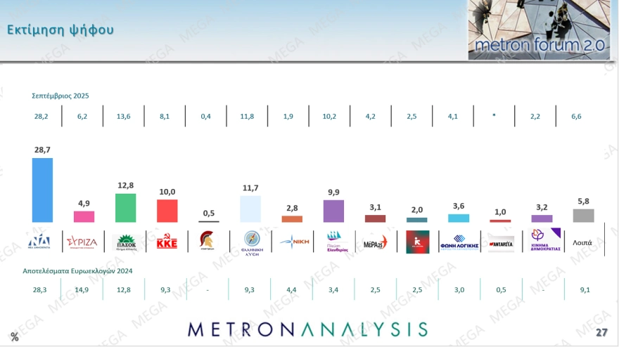 Ανάκαμψη μισής μονάδας για τη ΝΔ σε σχέση με την δημοσκόπηση του Σεπτεμβρίου μέτρησε η Metron Analysis στο γκάλοπ που παρουσιάστηκε στο κεντρικό δελτίο του Mega. Η εταιρία δίνει 28,7% στο κυβερνών κόμμα στην εκτίμηση ψήφου και 12,8% στο ΠΑΣΟΚ, που χάνει 0,8 της μονάδας μέσα σε ένα μήνα.