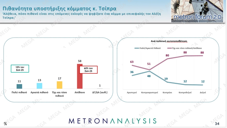 Ωστόσο, στην πιθανότητα ψήφου το κόμμα Τσίπρα λαμβάνει 24%, με τον σκληρό πυρήνα του να ανεβαίνει μία μονάδα σε σχέση με τον Σεπτέμβριο φτάνοντας στο 11% και τον ευρύτερο χώρο πιθανής ψήφου sto 13%, με άνοδο 2 μονάδων μέσα σε έναν μήνα. Η πλειοψηφία εκείνων που δηλώνουν έτοιμοι να ψηφίζουν ένα κόμμα Τσίπρα αυτοτοποθετούνται στην Κεντροαριστερά και την Αριστερά, διατηρεί όμως μειοψηφικά, αλλά όχι ασήμαντα ερείσματα τόσο στον χώρο του Κέντρου, όσο και μεταξύ των κεντροδεξιών και των Δεξιών.