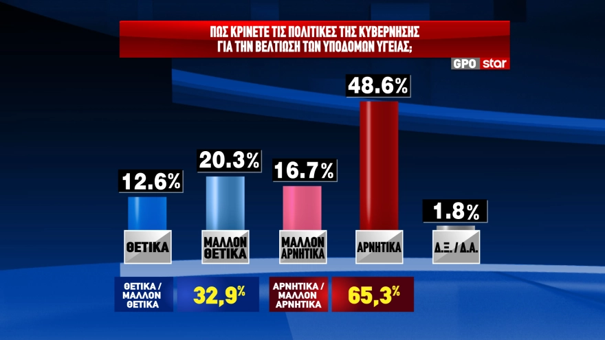 Το 79,6% των ερωτηθέντων κρίνει αρνητικά και μάλλον αρνητικά το έργο της κυβέρνησης, ενώ λόγω της υπόθεσης του ΟΠΕΚΕΠΕ, το 66,4% δηλώνει ότι έχει μειωθεί η εμπιστοσύνη του στην κυβέρνηση.