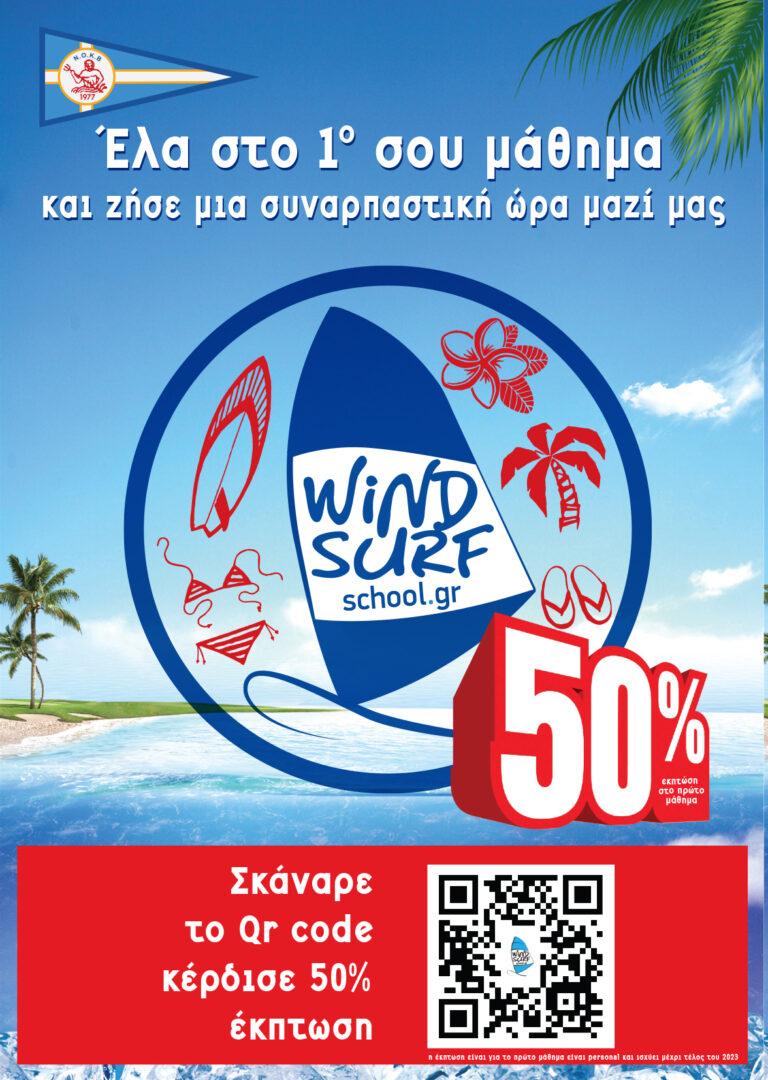 Για πληροφορίες αλλά και για να λάβετε τον κωδικό έκπτωσης σκανάρετε το QR Code ή επισκεφθείτε την ιστοσελίδα www.windsurfschool.gr