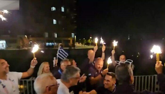 Θερμή υποδοχή έλαβε ο Λευτέρης Πετρούνιας κατά την επιστροφή του στο ολυμπιακό χωριό, μετά την κατάκτηση του χάλκινου μεταλλίου.