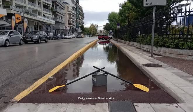 Θέλοντας μάλιστα να δείξει το πρόβλημα με μια δόση χιούμορ, πήρε κουπιά και πήγε στα σημεία που είχαν πλημμυρίσει για να δείξει ότι είναι απαραίτητο αξεσουάρ.