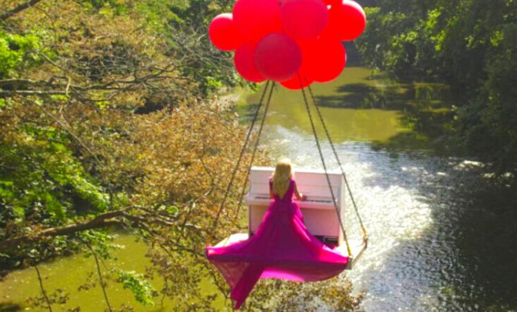 Ένα μαγικό θέαμα είχαν την τύχη να θαυμάσουν οι επισκέπτες των Τεμπών το απόγευμα της Κυριακής, καθώς μια πιανίστρια έπαιζε μουσική πάνω σε ένα αιωρούμενο πιάνο, «κρεμασμένο» από μεγάλα φούξια μπαλόνια.