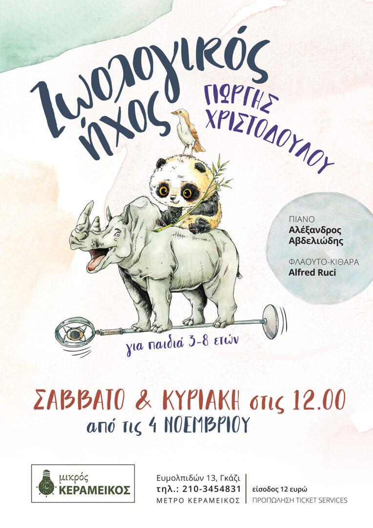 Ο Γιώργης Χριστοδούλου και οι συνεργάτες του σας περιμένουν από το Σάββατο 4 Νοεμβρίου και κάθε Σάββατο και Κυριακή στις 12 το μεσημέρι στον Μικρό Κεραμεικό στο Γκάζι, όπου παρουσιάζουν την πρωτότυπη παράσταση για μικρούς και μεγάλους “Ζωολογικό Ήχος”,με τα πιο όμορφα παιδικά τραγούδια για ζώα που έχουν γραφτεί ποτέ στην Ελληνική γλώσσα.