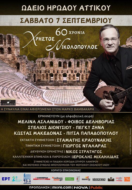 Ο κοσμαγάπητος συνθέτης των μεγαλύτερων διαχρονικών λαϊκών επιτυχιών Χρήστος Νικολόπουλος, γιορτάζοντας τα 60 χρόνια ενεργούς δράσης, καταξίωσης και αδιάλειπτης προσφοράς στον πολιτισμό και στα μουσικά δρώμενα της χώρας μας, το Σάββατο 7 Σεπτεμβρίου ανοίγει διάπλατα τις πύλες του Ωδείου του Ηρώδου του Αττικού για την πολυαναμενόμενη επετειακή του συναυλία, πλημμυρίζοντας με τις μελωδίες του την καρδιά της Αθήνας και έναν από τους εμβληματικότερους ιστορικούς χώρους της πρωτεύουσας.