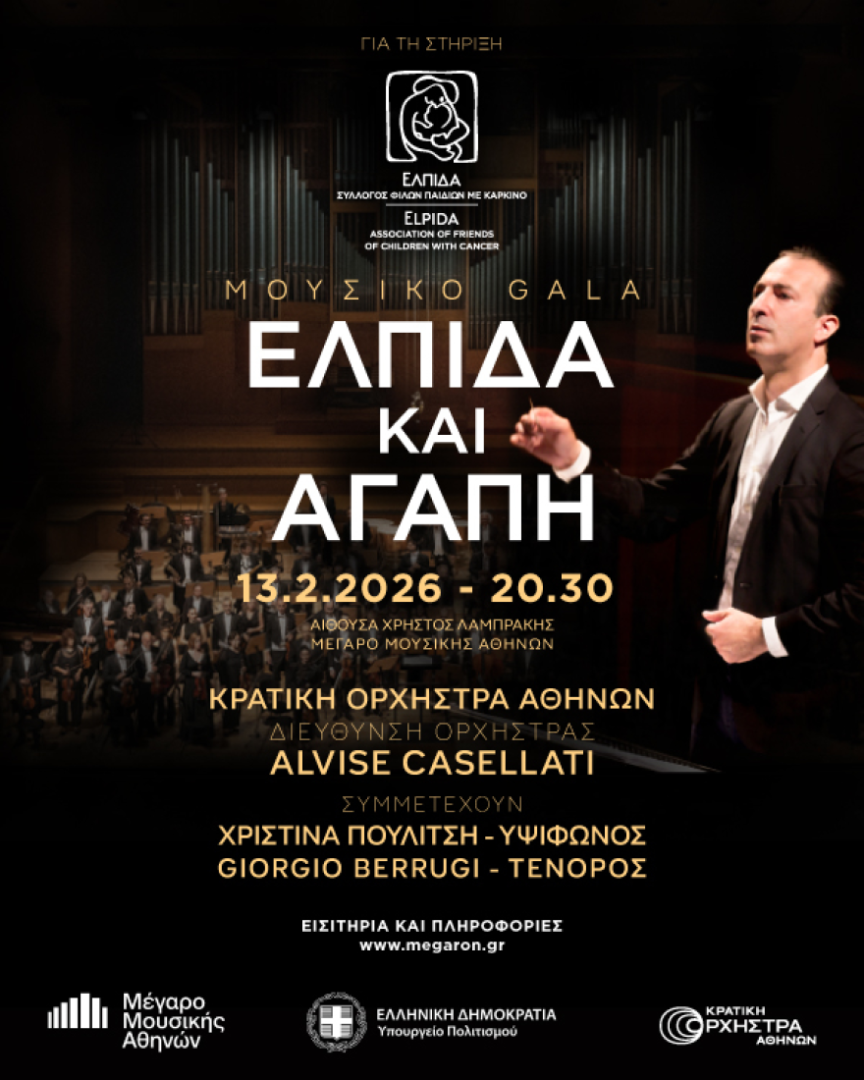 Το Σωματείο «ΕΛΠΙΔΑ-Σύλλογος Φίλων Παιδιών με καρκίνο», σε συνεργασία με το Μέγαρο Μουσικής Αθηνών και την Κρατική Ορχήστρα Αθηνών, διοργανώνουν ένα μοναδικό Μουσικό Γκαλά «Ελπίδας και Αγάπης» με τον διεθνούς φήμης μαέστρο Alvise Casellati, την Παρασκευή 13 Φεβρουαρίου 2026, στις 20.30, στην Αίθουσα Χρήστος Λαμπράκης του Μεγάρου Μουσικής Αθηνών.