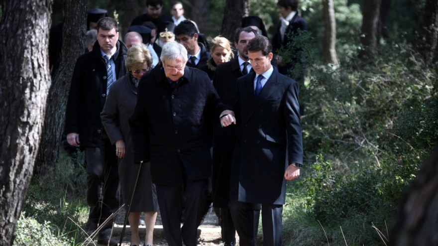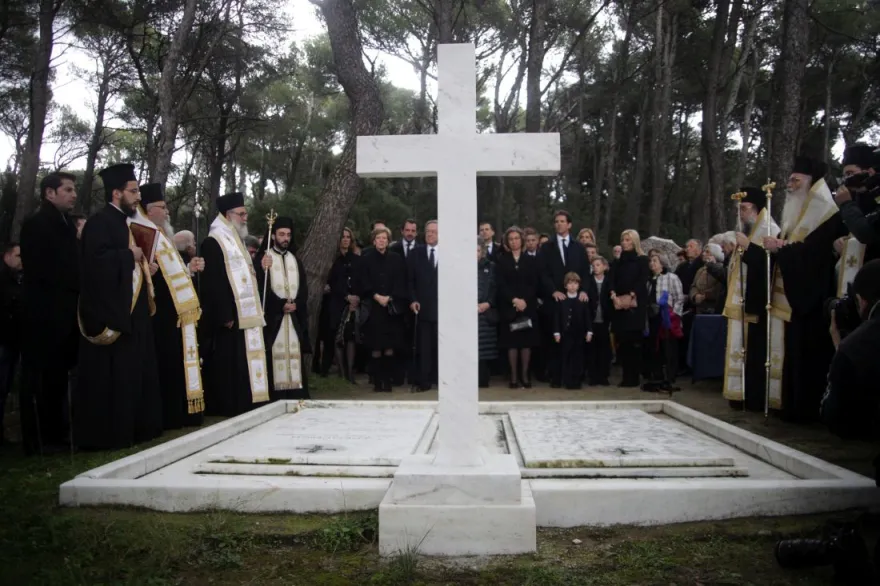Ο τέως βασιλιάς Κωνσταντίνος με τα μέλη της οικογένειάς του στο μνημόσυνο των γονιών του στο Τατόι, το 2015
