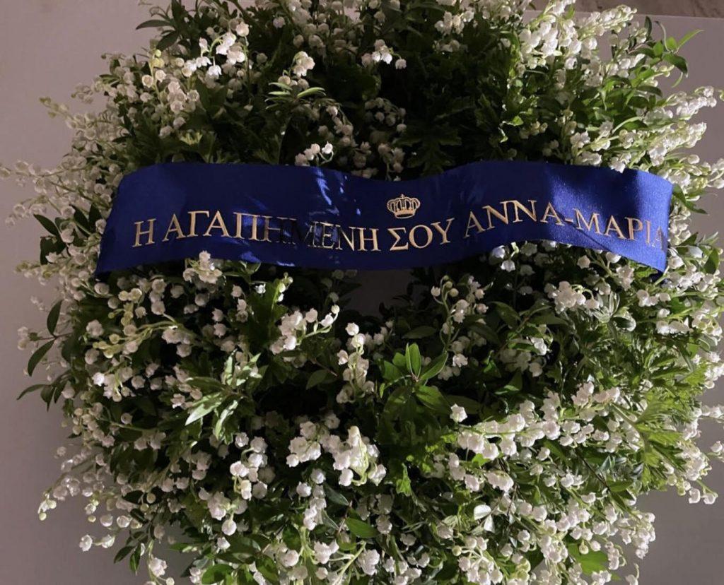 Φτιαγμένο εξ ολοκλήρους από «Κρίνους της Κοιλάδας», τα ίδια λουλούδια που συνέθεσαν τη γαμήλια ανθοδέσμη της το 1964 ήταν το στεφάνι τηςΑννας Μαρίας στον σύζυγό της, τέως βασιλιά Κωνσταντίνο.