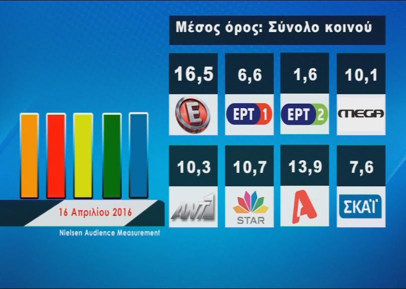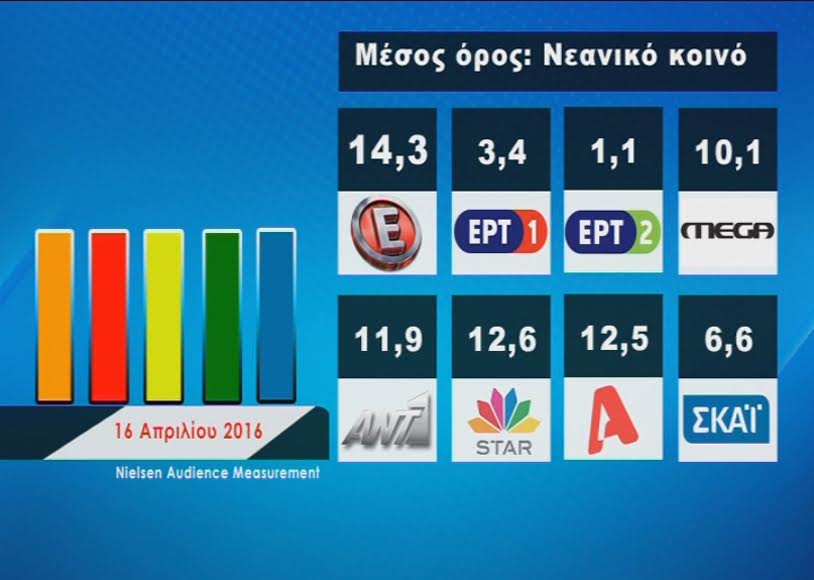 Συγκεκριμένα, το Σάββατο 16/04 σύμφωνα με την εταιρία μετρήσεων τηλεθέασης (Nielsen Audience Measurement Greece) το Ε κέρδισε επάξια την πρωτιά προγραμμάτων της Ελληνικής τηλεόρασης του συνολικού κοινού με 16,5%, καθώς και του νεανικού κοινού 15-44 με 14,3%, αφήνοντας πίσω με μεγάλη διαφορά ύψους ακόμη και 5,8% τα μεγάλα κανάλια!!!